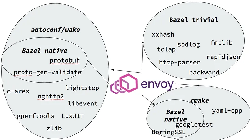 Envoy’s many and varied external dependencies below are shown, together with their upstream build systems: